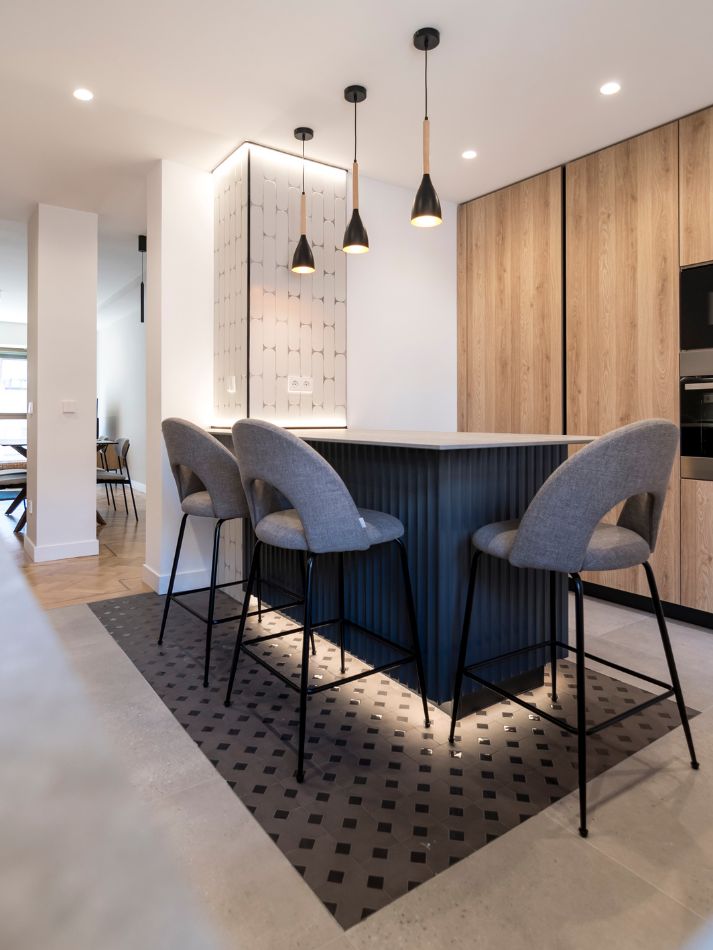 Se intervino sobre cocina, salón, comedor, aseo y baño. El proyecto se centró en ordenar el espacio, optimizar recorridos y dotar a cada zona de un carácter definido pero coherente con el conjunto. Una reforma integral que combina precisión técnica y personalidad.